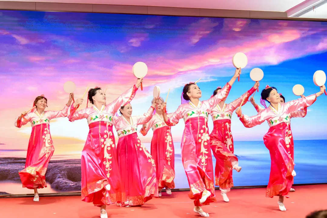 民族舞课的长辈们带来朝鲜舞《红太阳照边疆》,她们神采奕奕,舒展自如,仿佛让观众置身于辽阔的边疆。