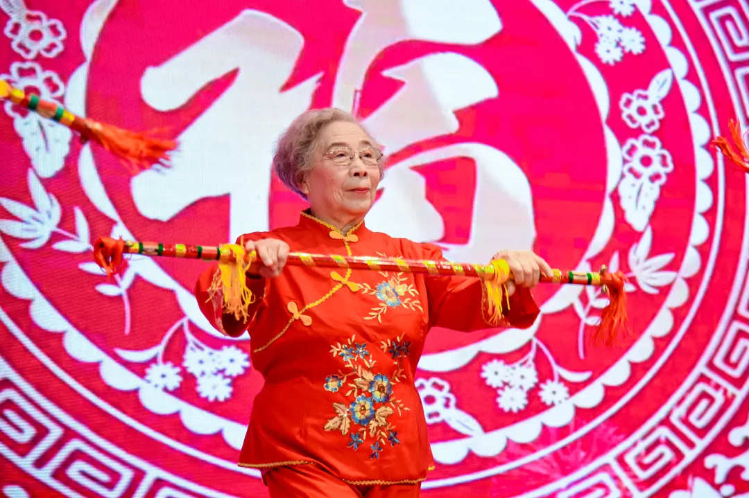 居民于阿姨携手青春养老人带来非物质文化遗产花棍表演《祖国你好》,于淑坤阿姨从5岁就开始练习打花棍,作为花棍的传承人,于阿姨在琴园更是开设了花棍学习小组。