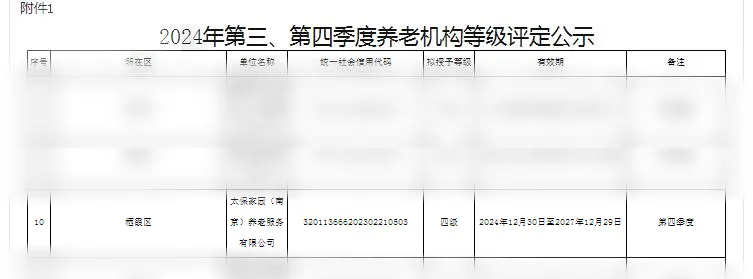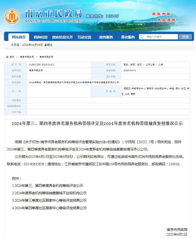 4月1日,南京市民政局正式公示2025年度第一季度养老服务机构等级评定结果。