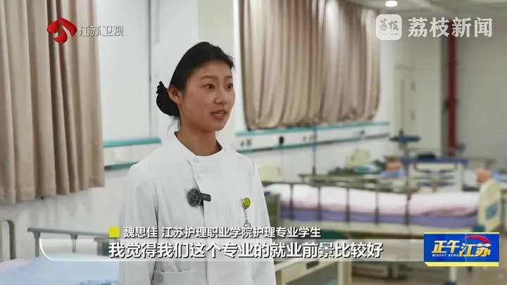 江苏护理职业学院护理专业学生魏思佳说:“我们这个专业的就业前景比较好,就业缺口也比较大,而且薪资待遇也都非常不错,护理员也可以参加职称评定,让我们在新的赛道上青春逐梦。”