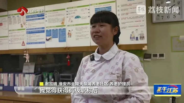 淮安市金陵天泉湖养生养老社区养老护理员谢加娥说:“获得高级工职称后,感觉更有职业认同感了,代表社会对我们养老护理员这个职业的认可。这既是一种荣誉,也是一种责任,也让我更有动力。”