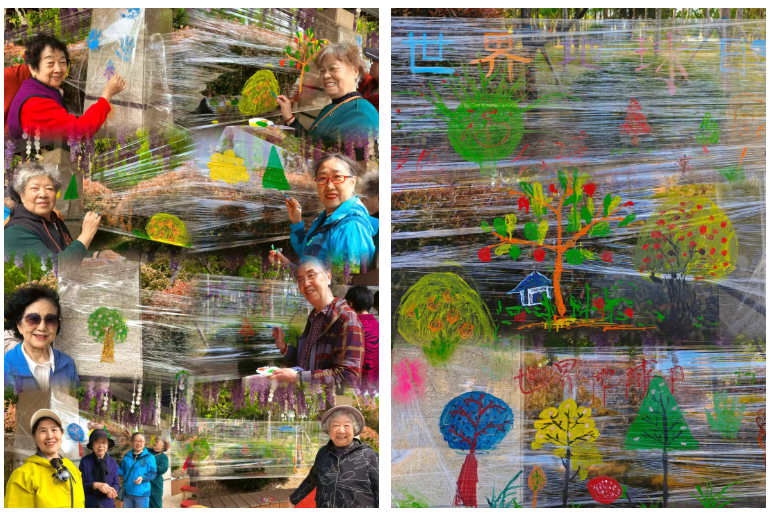 4月22日,第55个世界地球日,社区服务部开展了一场别开生面的“森林膜法画”创意活动。长辈们相聚在不其园紫藤长廊,以保鲜膜为画布、颜料为笔,在洒落斑驳光影的春日阳光下创作。10米长保鲜膜下,他们以“守护地球”为主题作画,阳光穿透画作似“空中画廊”。长辈们合作完成了“花开地球”作品。