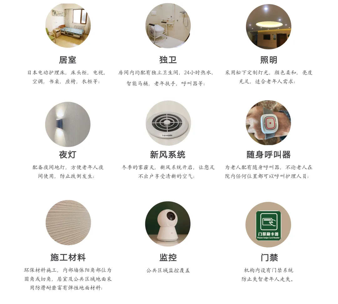 房间内配置有整体的固定式家具、上滑轨平移门、整体卫浴、智能空气净化系统、干式地暖、环保壁纸等适老化设施,为老人提供更加安全、舒适的居住环境。