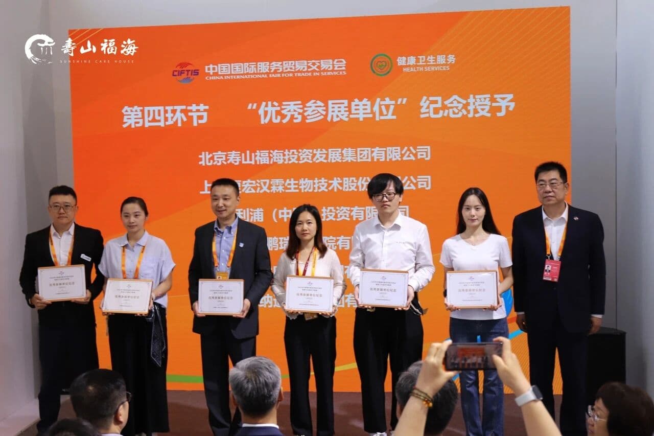 在成果发布专区,还举行了2025中国国际服贸会健康卫生服务专场的授奖活动,由北京市疾病预防控制局党组书记、副局长曹昱为张燕院长现场颁发 “服贸健康大讲堂特邀科普专家” 证书。由北京市医养卫生科促中心主任张静波为寿山福海养老集团颁发“优秀参展单位”的证书,肯定了寿山福海对于2025年度中国国际服贸会的积极参与和专业贡献。