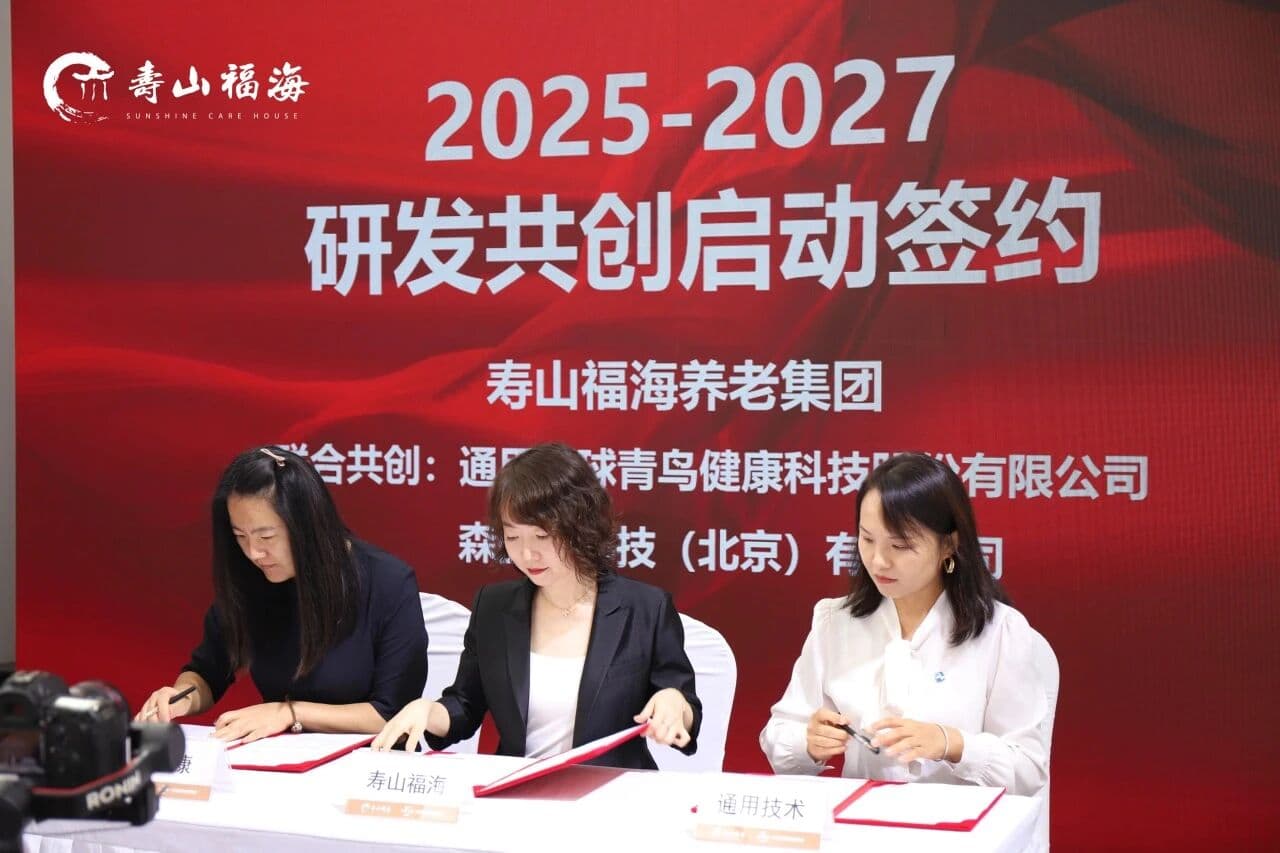 在2025-2027年度研发共创签约环节,寿山福海养老集团与通用环球青鸟健康科技股份有限公司、森丽康科技(北京)有限公司正式达成三方深度合作。