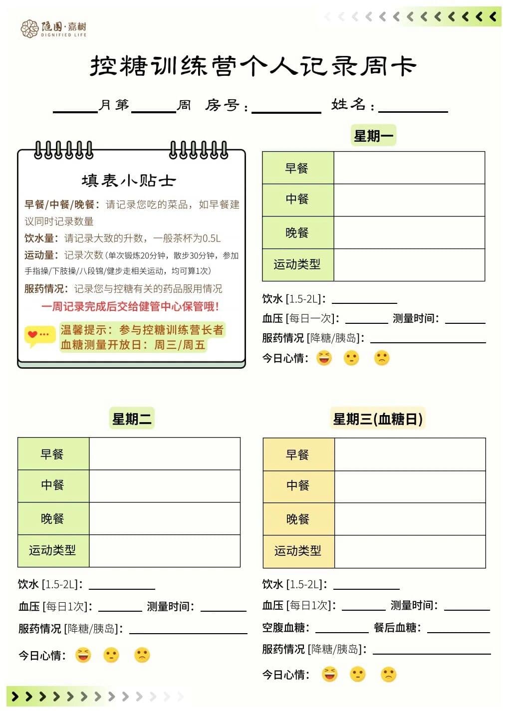 本期控糖训练营将持续至10月26日,通过多维度干预方式引领长者建立健康生活习惯。一张张控糖训练周卡,指导长者详细记录每日饮食、运动、血压及服药情况,每周三、周五设立血糖检测开放日,监测健康指标。