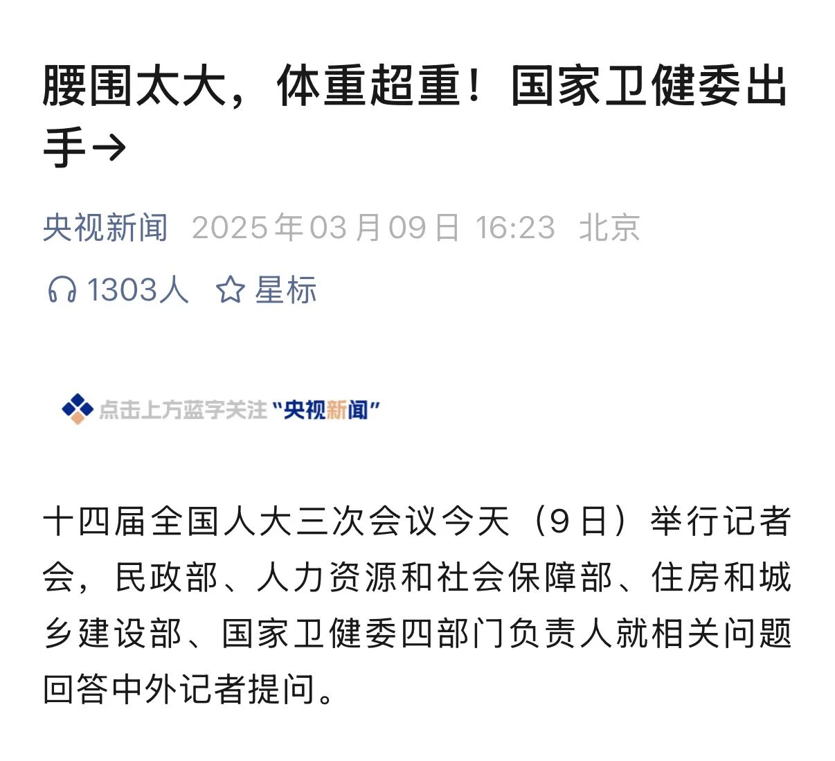 今年两会期间,国家卫健委主任用7分钟时间谈体重管理,而在2024年,16个部门联合启动了为期三年的“体重管理年”活动。