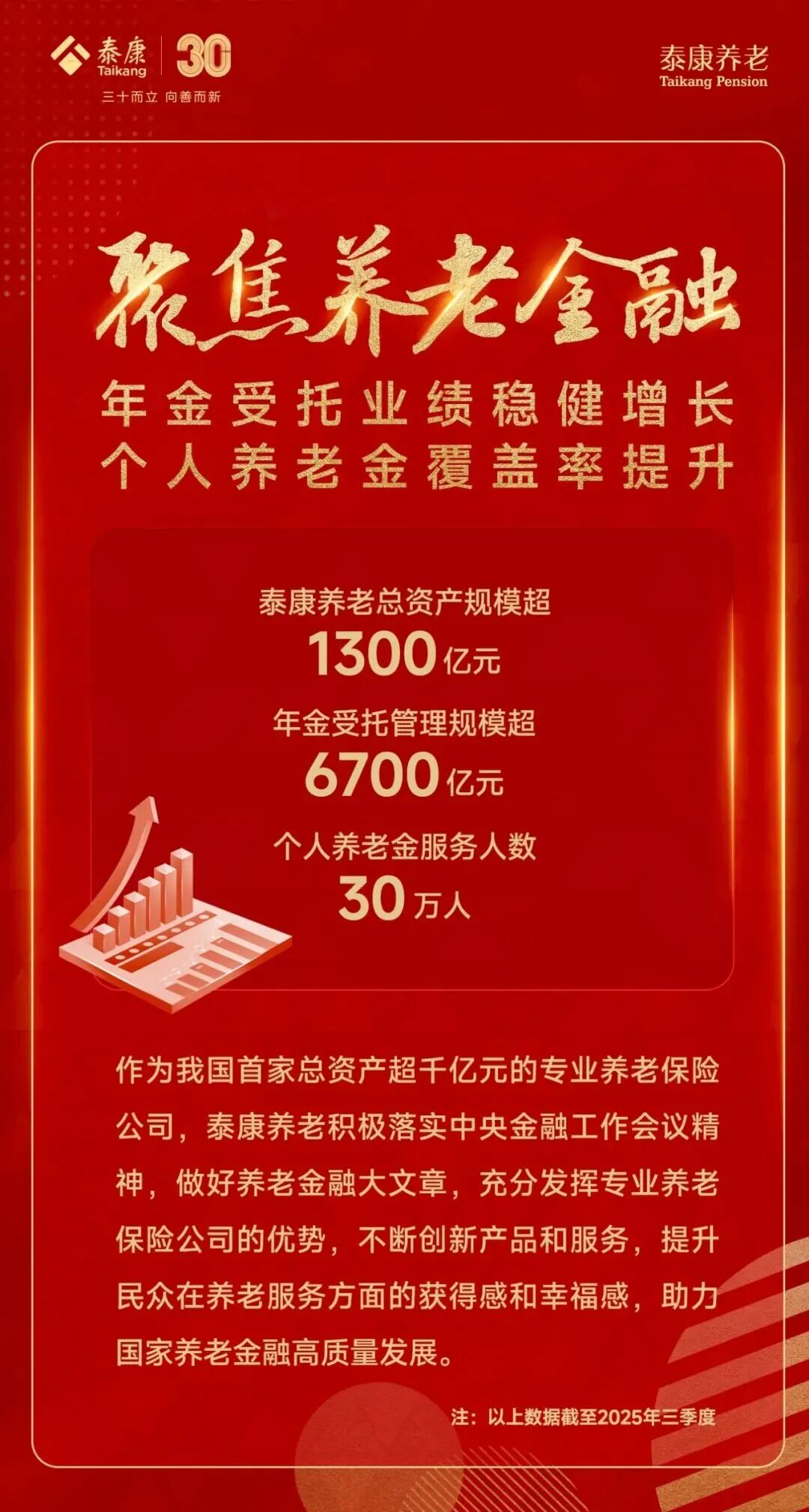 截至目前,泰康资产投资管理的养老金管理规模约1.3万亿元,持续巩固养老金管理领域领先地位。在企业年金管理方面,截至2025年第三季度末,泰康资产投资管理的企业年金基金组合资产超过6900亿元,居市场前列。
