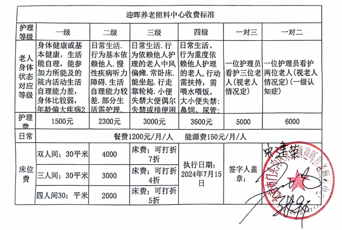 迎晖北苑养老照料中心的价格/收费/入住须知