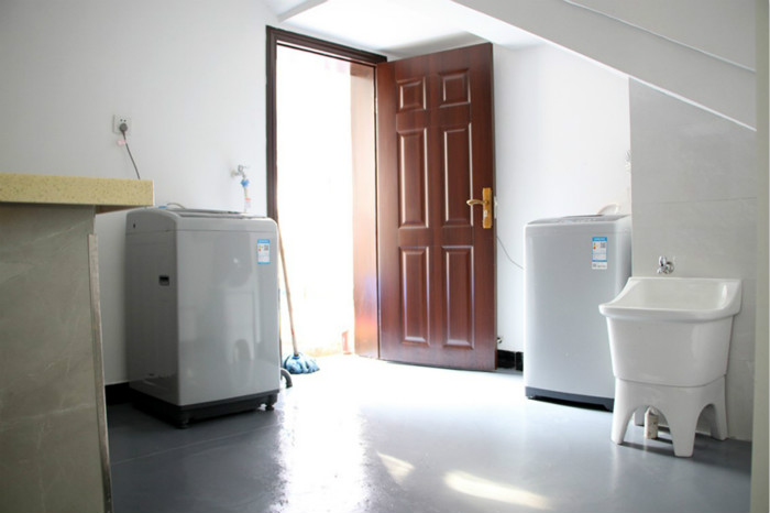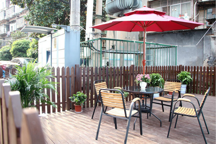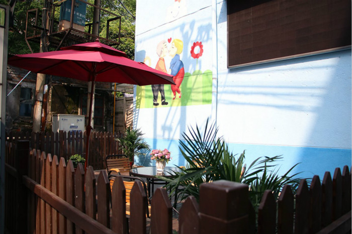 外墙设计以明度适中的天空蓝为主色调,室外活动场地进行全面提质改造,设户外花园约50平方米,布置绿化,安置桌椅、遮阳伞,保证老人户外活动的需求,为老人提供私密、安全的用来休息交谈或浇花养草的休闲场所。
