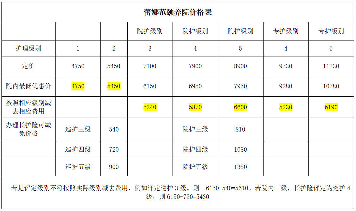 对于3级以上的长者,若是烟台本地退休职工,身体情况达到一定失能失智状态可以申请长期护理保险的减免。减免费用如上表所示。相关的长护险金额会抵扣入住费。最终费用为4750元/月至6600元/月不等。对于不能享受长护险价格的长者,则按照级别享受院内最低优惠价格。