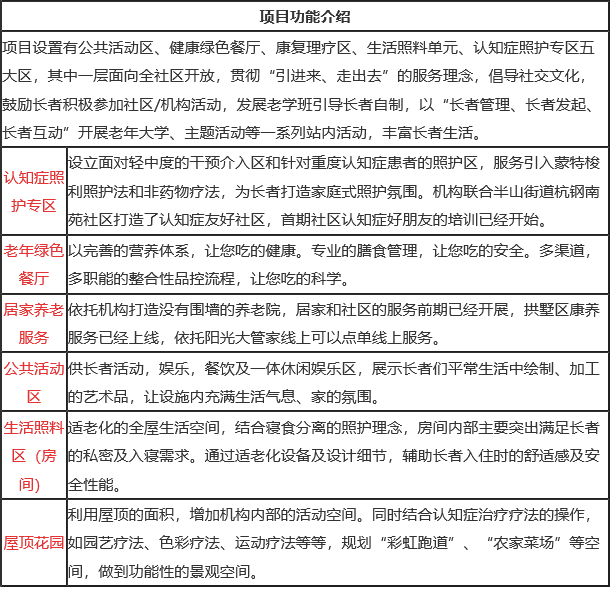 朗诗常青藤-桃源站设计参照单元式照护的分区理念,设立中心景观区、三个生活照料区、一个认知症照护专区。二楼认知症专区设立面对轻中度的干预介入区和针对重度认知症患者的照护区,服务引入蒙特梭利照护法和非药物疗法,为长者打造家庭式照护氛围。同时,依托机构打造没有围墙的养老院,居家和社区的服务前期已经开展,拱墅区康养服务已经上线,依托阳光大管家线上可以点单线上服务。居家方面,机构联合半山街道杭钢南苑社区打造了认知症友好社区,首期社区认知症好朋友的培训已经开始。